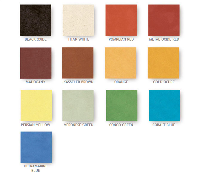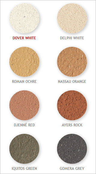 Dover White, Delphi White, Roman Ochre, Djenné Red, Nassau Orange, Ayers Rock, Iquitos Green and Gomera Grey. These standard clay colors can be mixed together or combined with other natural Tierrafino pigments, opening up an almost unlimited range of tones. The different sized grains add extra vibrancy and warmth.
